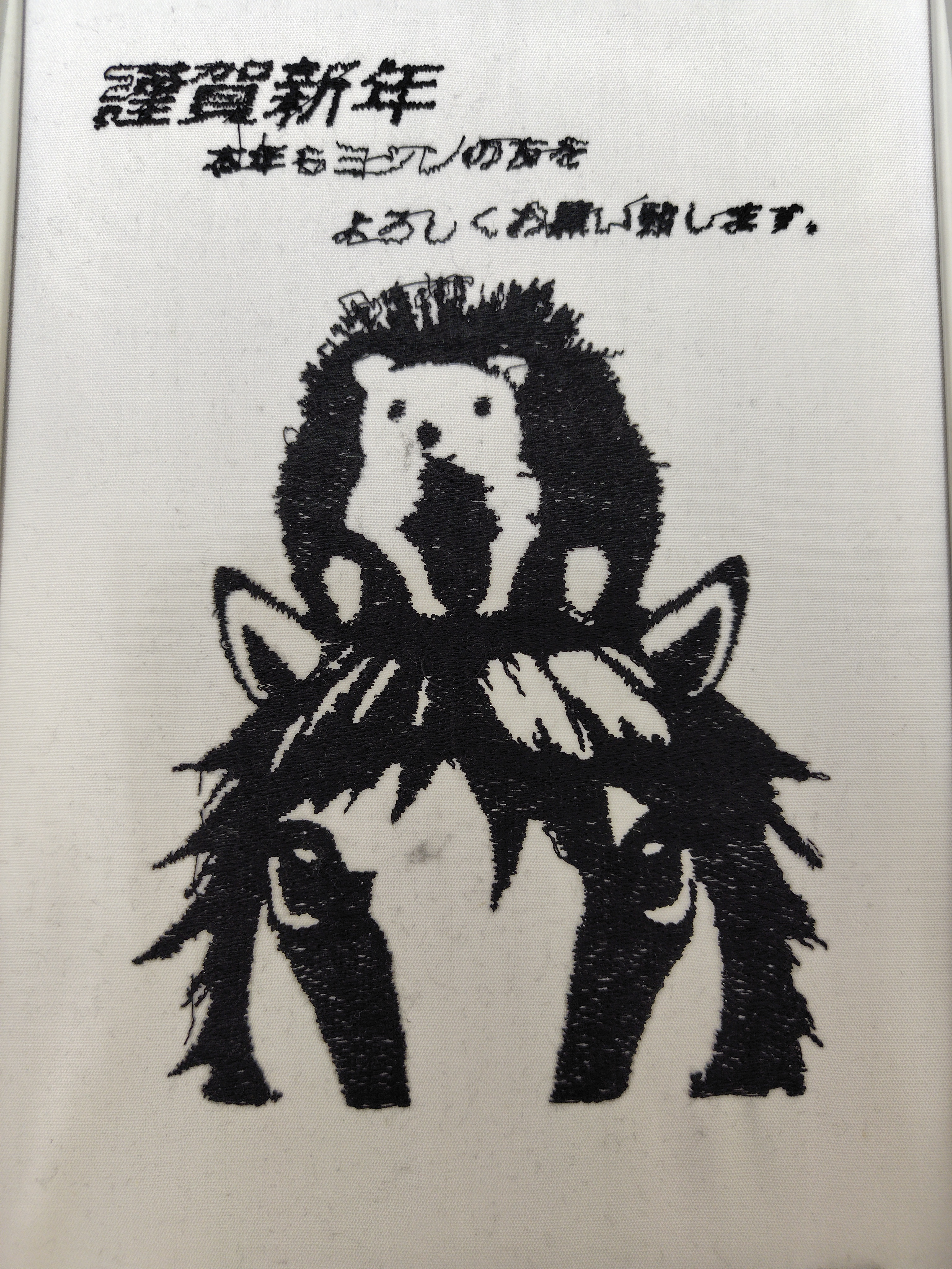 遅くなりましたが、今年も刺繡ミシンで新年挨拶イラスト刺繡を作ってみました。